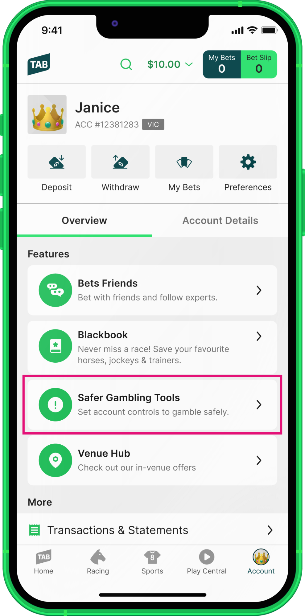 3. Tap ‘Safer Gambling Tools’.